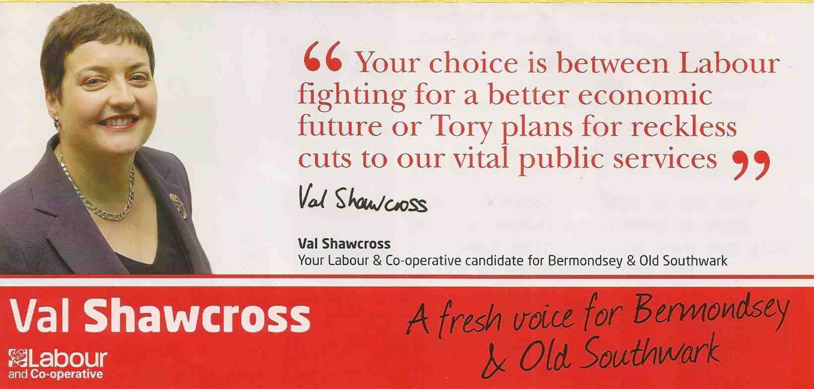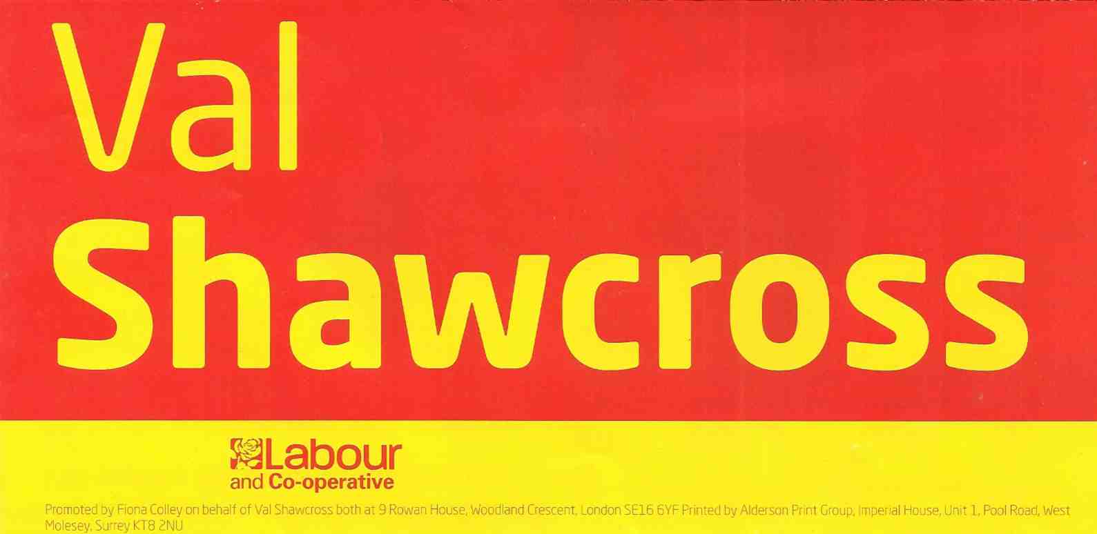 Promoted by Fiona Colley on behalf of Val Shawcross both at 9 Rowan House, Woodland Cresent, London SE16 6YF